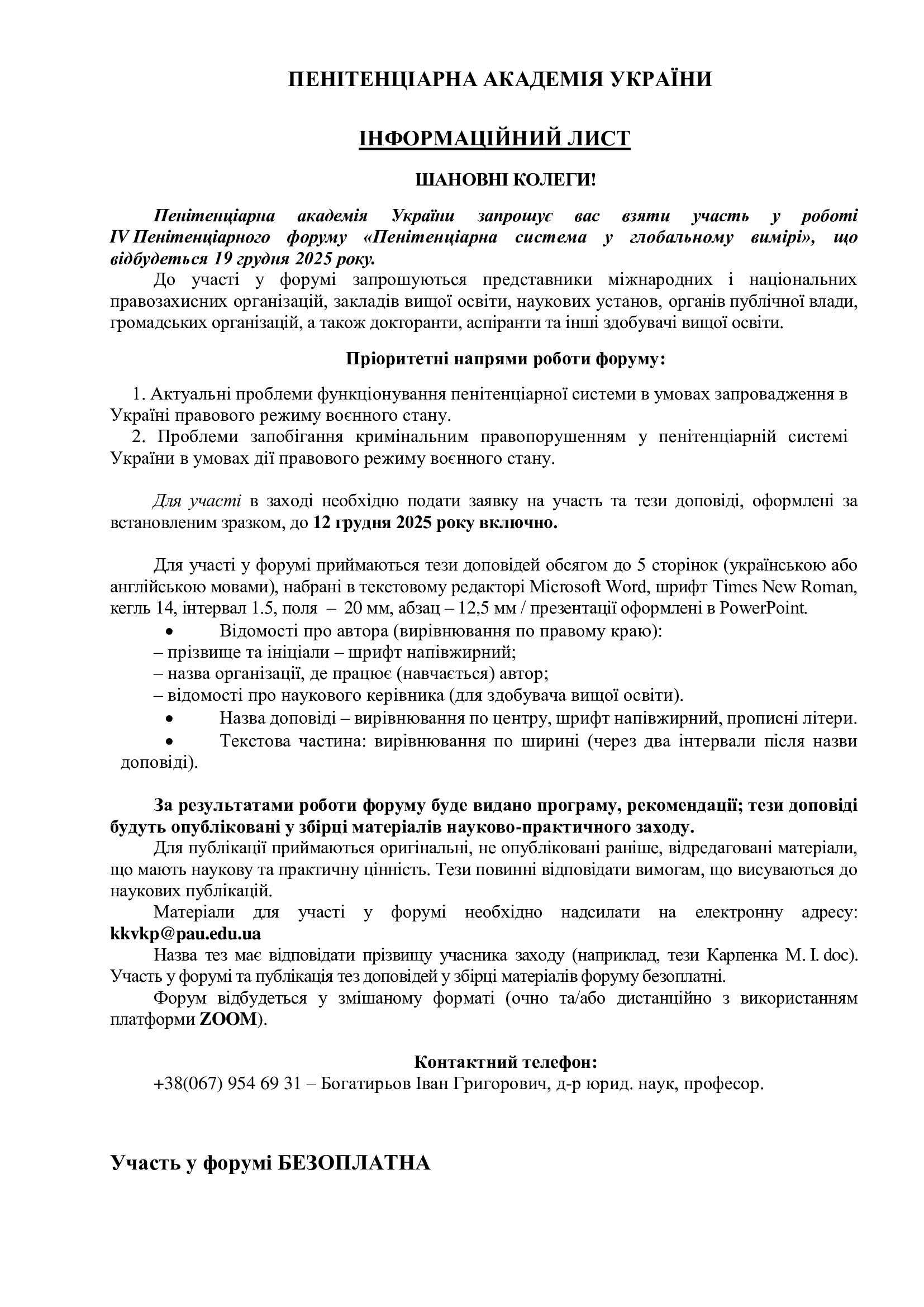 Пенітенціарна академія України запрошує вас взяти участь у роботі IV Пенітенціарного форуму «Пенітенціарна система у глобальному вимірі», що відбудеться 19 грудня 2025 року.